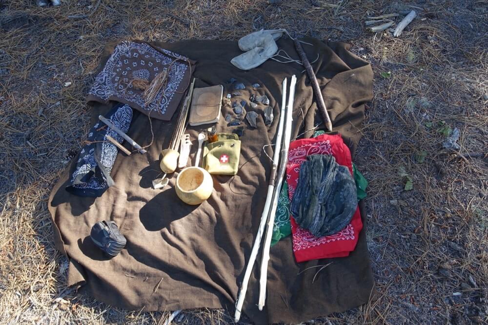 Einige Stofftücher, den Rest haben wir uns in den Vorbeieitungstagen selber hergestellt. – Steinklingen, Bogen, Fallen und eines der aller Wichtigsten: – Schnur. Auch Verbandszeug, ein Tagebuch und eine Kamera durften mit
