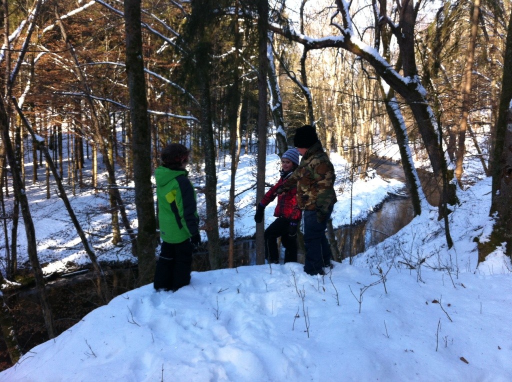 „Links vorbei am Jägerstand, hoch oben hängt das Plastikband, durch den kleinen Fichtenwald, übers Feld ist’s eisig kalt. Im Wald rutschen wir runter, dann sind alle munter! Auf der Suche nach dem blauen Zwerg geht’s entlang dem Winterberg….“